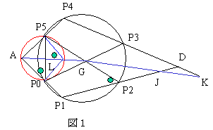 また3点A,P0,P5を通る円を描き、AGとの交点をLとする。
