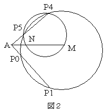 つまり、Aの円P0P1Mに対する方ベキとAの円P4P5Mに対する方ベキが等しいので、Aはこの2円の根軸上にある。