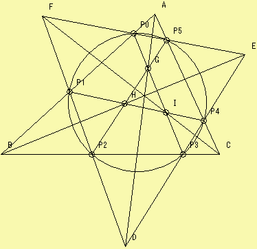 また、P0P1P2P3P4P5に関するパスカルの定理より、BCとEFの交点、CAとFDの交点、ABとDEの交点は1直線上にあるので、デザルグの定理の逆により、AD,BE,CFは1点で交わる。