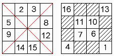 4次の方陣の場合を例にとれば、図1のように仮にあてはめる。