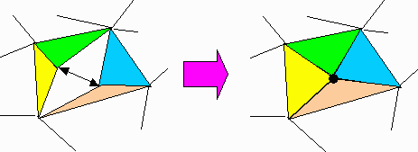 従って、次の規則で辺に色をつけながら、逆の手順をたどって、4面体から元のSにたどり着けば、完成した塗り分けは題意を満たす塗り分けである。