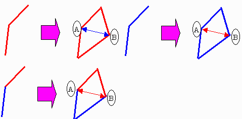 以上のように塗り分けると、上図のように分離された点A,B間には赤のみ経路と青のみ経路が必ず存在し、実質1つの点と同じである。
