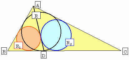 弦の半長を a,b,c 、 弦と外接円中心との距離を A,B,Cとします。