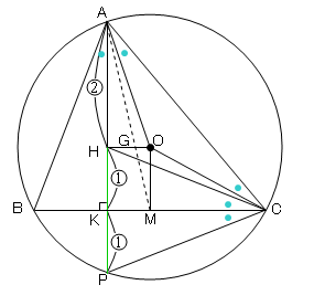 図4のように、辺BCの中点をMとし、頂点Aから対辺に下ろした垂線をAKとし、AKの延長が再び円Oと交わる点を点Pとする。
