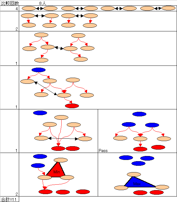 先頭の人(A)を「仮の中央値」とし、B以下との対戦を順次行い、Aより強い人を上位者枠に弱い人を下位者枠に詰めて行く。