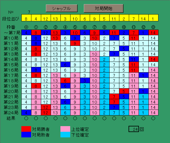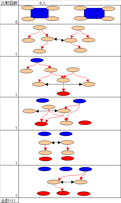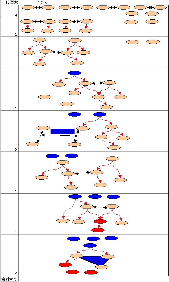 これは、優勝者またはドベを1人決めることであり、トーナメントの試合数の理論からも明らかである。