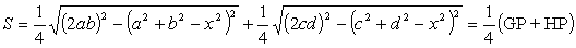 | S = | 1 4 | {2ab sinα + 2cd sin(π-β)} = | 1 4 | ( GP + HP ) … (注) |