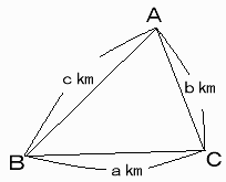 三角形の頂点A,B,Cの位置に3校があり、この3校を連結するネットワーク(どの2校もネットワークを通して、行き来できるようにする)を結ぶ計画があります。 ただし、BC=akm,CA=bkm,AB=ckm です。 |