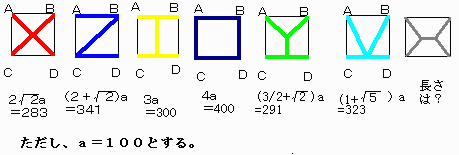 正方形の頂点A,B,C,Dの位置に4校があり、この4校を連結するネットワーク(どの2校もネットワークを通して、行き来できるようにする)を結ぶ計画があります。 |