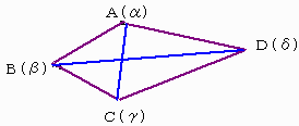 <証明> 複素数平面上で4点A、B、C、Dの座標をそれぞれα、β、γ、δ とする。