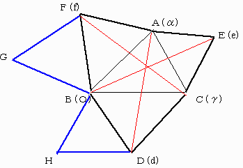 定理4 △ABCの辺BC,CA,ABを1辺として正3角形CBD,ACE,BAFを△ABCの外側に作ると、次のことが成り立つ。