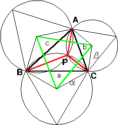 正3角形ABCの平面上の任意の点をPとして、次の不等式が成り立つ。 |