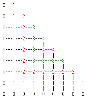 8段を例に、各−の交点に右上の角がくる正方形の数を、その交点に記入すると以下になります。