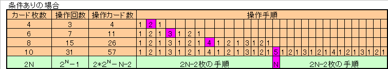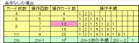 そのような方法は幾つかあるが、操作カード枚数を最小にするには、束の中心のカードほど反転させる回数を少なくする方が良く、下表の方法が最小である。