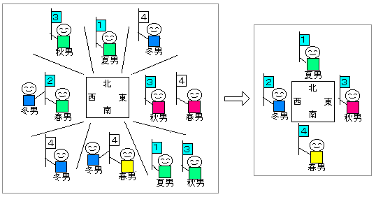 (1番は夏男。)2番は冬男。(3番は秋男。)4番は春男。