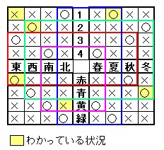そして、「北は黄色ではない」「東は赤」「冬男は青で西」から