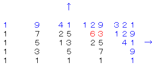 この数列では四角の数が左、左下、下の三数の和になっているので