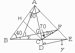 ∠IAH=20°だから,∠AIH=20°で,∠IHB=40°である。