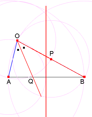 ●∠AOBの二等分線と線分ABの交点Qが求める点になります。