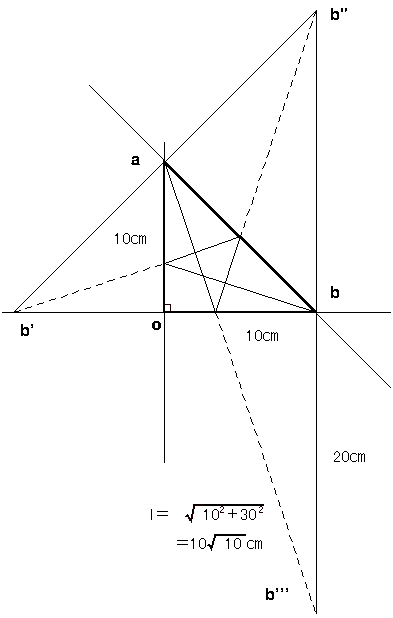 同様に点b’が鏡abで作られる鏡像をb”、さらに鏡boでの鏡像をb'''とすると、a点からみたb点の鏡像に向かって玉を転がせば3度反射してb点に到達します。
