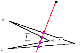 これらで引いた線、あるいは他のやりかたで引いた線のどれでもいいから1本をとり、三角形の周との交点をA,Bとする。