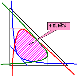 3角形の場合は、各2辺3組を漸近線とする、所定の面積分割線(点Qを通る必要ない)に接する(=包絡される)3つの双曲線で囲まれた内側です。