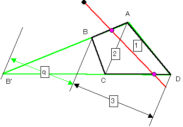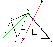 AB,CDを延長した交点をB’とするとき、新たに加わった三角形部分BB'Cの面積と元の4角形の面積の比は、例えば線分ACを底辺とする三角形を考えることにより、下図のように幾何学的な長さの比として作図可能である。