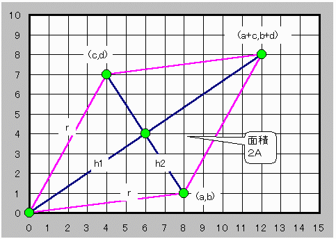 (0,0) (a,b) (a+c,b+d)(c,d)を頂点とする4角形を考えるとき(1)により