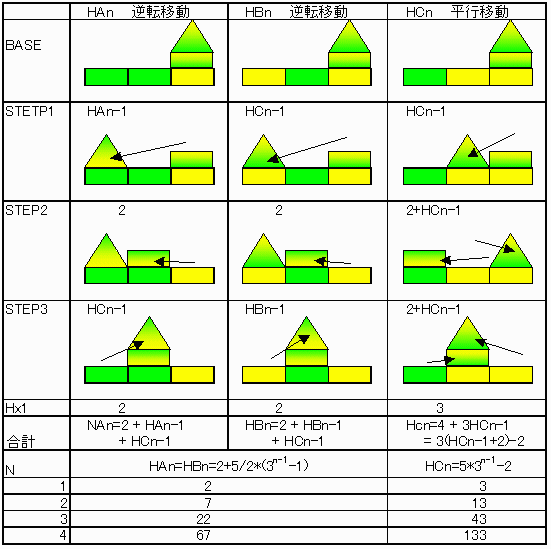 なお、上記手順表では2段積みのハノイの塔移動は色順を逆転(色が変わる)させる方法のみで示しているが、全部平行移動でも可能である。