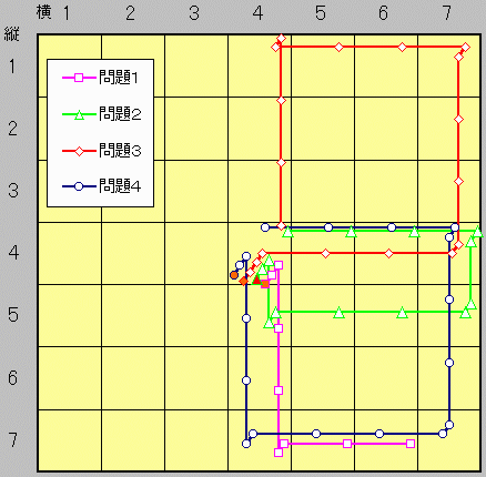 例 左→左→前→左→前→前→前 [この時亀は(5,7)にいる] →左→前→左→前→前→前【問題3】