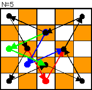 N>5の場合、N=4ないしN=3,5の回廊の半周経路を繋ぎ合わせることにより、「空白」を任意の対角線上に移動が可能である。
