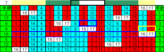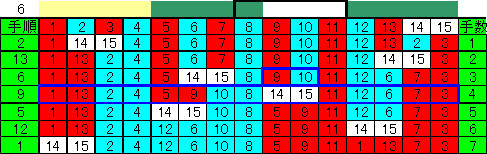そして[(N+3)/2]手目で右端の2個を移動(N=7の図黄色枠部)すると中央の3個のまとまりを除き、同種2個ずつ左右対称にまとまった形になる。