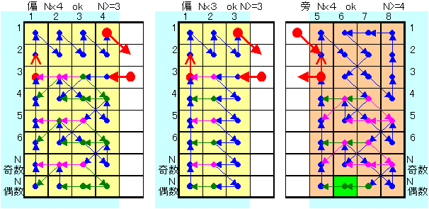 よって、図に示すパーツを挟むことによって、任意のnに対して全ての枡目を通る経路が存在する。