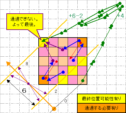 残りの未知の手順(紫→)は合計12手で、(5,5)→(1,1)の方向に対して全部3単位移動なので、結局その方向に6単位とびでしか最終位置はありえない。