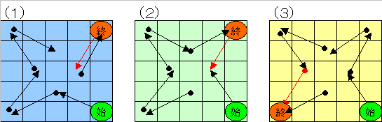 下図において、黒マスは上図で通過済みマスであり、始点と終点はそれぞれ再構成してある。
