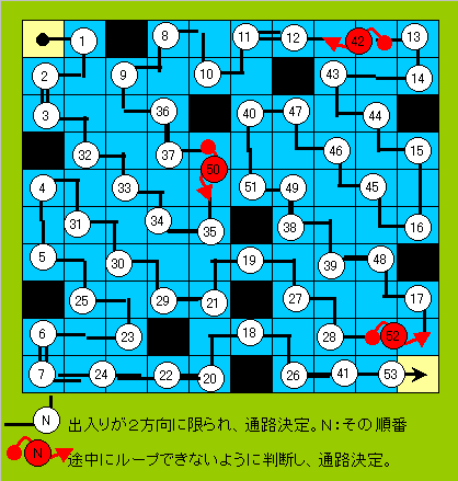 ∵出入りが2方向に限られ通路が決定するもの、及びループにならない通路の選択を順につめて行くと、下図のようになり、1通りしかなかった。