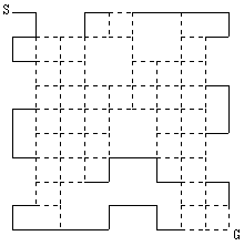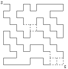 したがって、すべての白いマスを1度ずつ通ってS(1,1)からG(10,10)まで亀が進む経路はただ1通りに決定し、その経路は図13を再び座標で表示し直すことによって得られる。