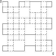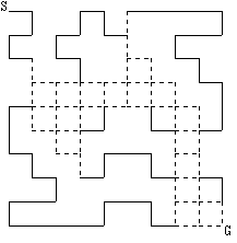 このように考えて、亀がSからGまで進む過程で絶対に通り得ない経路を図2から削除すると、図3のようになる。