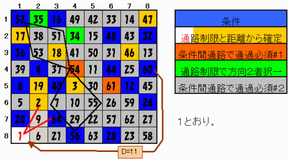 このうち"12","28","40","56"のマス目には実際には到達できないことがわかる。