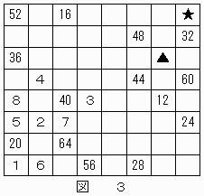 数字"2"が(6,2)(▲の位置),"3"が(5,4)(■の位置)のマス目に記すことができ、その結果、図2のようになる。