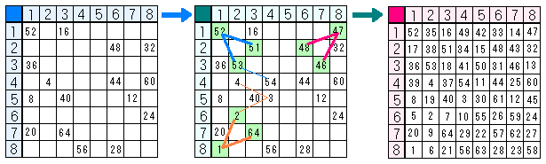 次に"54"が記されるマス目を決定する。