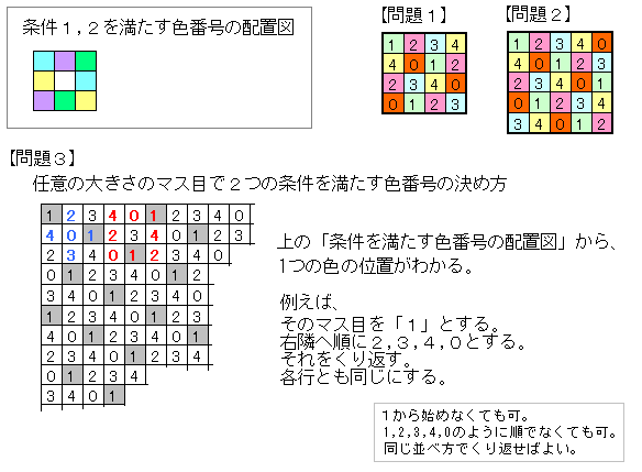 実際には、問題2で条件を満たすように5行×5列のマス目の色を塗ることができたならば、残りのマス目についてはその5行上または5列左のマス目と同じ色を塗ればよい。