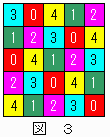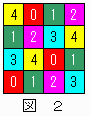 5つのマス目(1,2),(2,1),(2,2),(2,3),(3,2)の色番号がそれぞれ