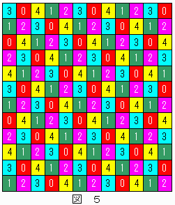 つまり、条件を満たすように色を塗った5行×5列のマス目を単位として、それらをタテ・ヨコに並べることによって、任意の大きさのマス目に対する色の塗り方が得られる。