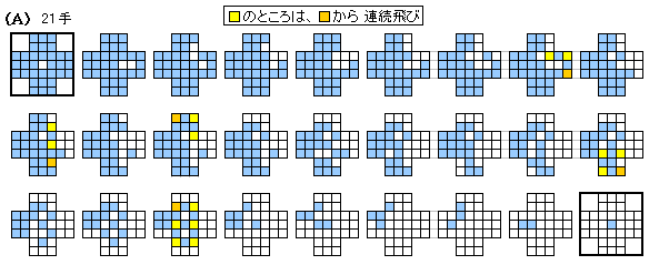 [A] 21手 (4,6)→(4,4),(2,5)→(4,5),(3,7)→(3,5),(4,5)→(2,5),(1,5)→(3,5), (3,4)→(3,6),(5,7)→(3,7),(3,7)→(3,5),(6,5)→(4,5),(4,5)→(2,5), (1,3)→(1,5),(1,5)→(3,5),(5,3)→(5,5),(5,6)→(5,4),(7,3)→(5,3), (4,3)→(6,3),(7,5)→(7,3),(7,3)→(5,3),(5,3)→(5,5),(5,1)→(5,3), (2,3)→(4,3),(4,3)→(6,3),(6,3)→(6,5),(6,5)→(4,5),(4,5)→(2,5), (2,5)→(2,3),(4,1)→(4,3),(4,4)→(4,2),(3,1)→(3,3),(2,3)→(4,3), (4,2)→(4,4) [B] 21手 (4,6)→(4,4),(6,5)→(4,5),(4,4)→(4,6),(5,7)→(5,5),(2,5)→(4,5), (4,5)→(6,5),(7,5)→(5,5),(3,7)→(3,5),(4,7)→(4,5),(4,5)→(2,5), (1,5)→(3,5),(6,3)→(6,5),(6,5)→(4,5),(4,5)→(2,5),(2,4)→(4,4), (4,4)→(6,4),(4,3)→(6,3),(7,3)→(5,3),(3,2)→(3,4),(1,3)→(1,5), (1,5)→(3,5),(3,5)→(3,3),(2,3)→(4,3),(4,3)→(6,3),(5,1)→(5,3), (7,4)→(5,4),(5,4)→(5,2),(3,1)→(5,1),(5,1)→(5,3),(6,3)→(4,3), (4,2)→(4,4) [C] 21手 (4,6)→(4,4),(2,5)→(4,5),(3,7)→(3,5),(4,5)→(2,5),(1,5)→(3,5), (6,5)→(4,5),(4,5)→(2,5),(1,3)→(1,5),(1,5)→(3,5),(3,4)→(3,6), (5,7)→(3,7),(3,7)→(3,5),(5,3)→(5,5),(5,6)→(5,4),(7,3)→(5,3), (5,3)→(5,5),(5,1)→(5,3),(4,3)→(6,3),(7,5)→(7,3),(7,3)→(5,3), (4,1)→(4,3),(4,3)→(6,3),(6,3)→(6,5),(6,5)→(4,5),(4,5)→(2,5), (2,3)→(4,3),(3,1)→(3,3),(4,4)→(4,2),(2,5)→(2,3),(2,3)→(4,3), (4,2)→(4,4)