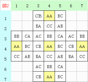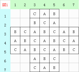 ABC CAB CABCABC BCABCAB ABCABCA BCA ABCマス目に上のようにA、B、Cをつける。