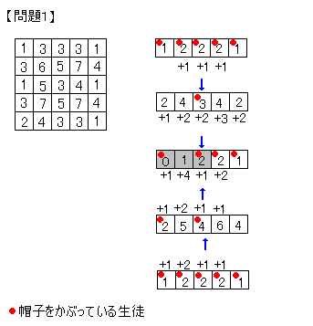 左列真中の1は下の3の生徒が帽子を被っているのが確定しているので、周りの他の生徒は帽子を被ってないことになります。?,?,?,?,?,