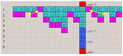L=100の場合で見ると、第1段階で○が横に2個並んだものを、縦に隙間無くつなげていくと、96手目には○が96個縦に並んだ列が2列出来上がる。