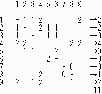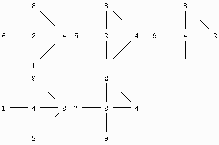 1〜9を9角形の頂点において、条件に合う2つの数を線で結び、できたグラフから条件に合うパターンを選びだしました。