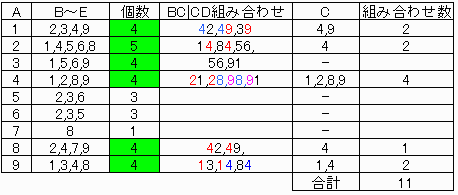 また[C]にはAと組になるものの数字間での条件を満たす組み合わせに、2組以上かかわる数字を入れなければならない。